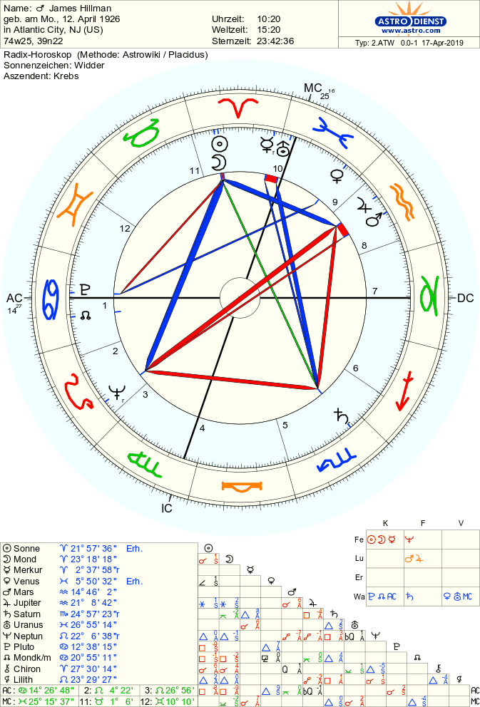 Not everyone knows that J. Hillman’s son is an astrologer and about the time of birth of his father we find on Astro Databank: <<In February 2018, his son Laurence Hillman writes: “I am a professional astrologer with 40 years of experience and I had many conversations with my father about his birth chart and time. I saw the handwritten note in the handwriting of his mother’s hand, which had the last hour of birth, the time of 10:20 a.m., with a Cancer Ascendant of 14 degrees and 27 minutes. Later in his life he began to accept this chart although, as Rick Tarnas points out, at first he was reluctant. “>>